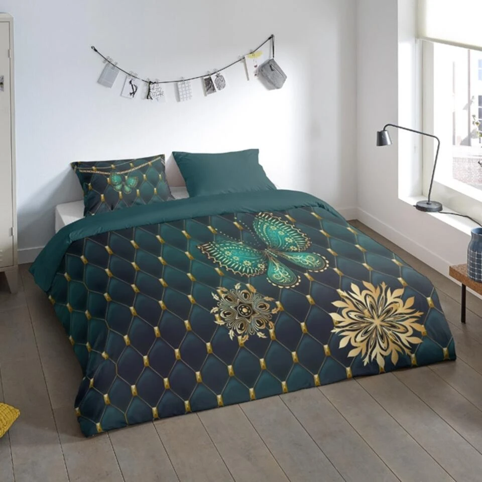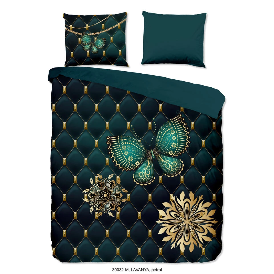 Dekbedovertrek “Lavanya” van Pure met vlinder, in de kleur “Petrol” is gemaakt van 100% Microfiber. Het is een prettige stof, gemaakt van synthetische garen maar vergelijkbaar met het natuurlijke materiaal katoen, doordat het zacht en soepel aanvoelt. Het is geschikt voor ieder jaargetijde en door de lichte glans heeft het een luxe uitstraling. Na het wassen is deze stof snel droog en kreukt niet tot nauwelijks waardoor strijken (vrijwel) niet nodig is. Ook beschermt het tegen bacteri’n, vuil en huisstofmijt
